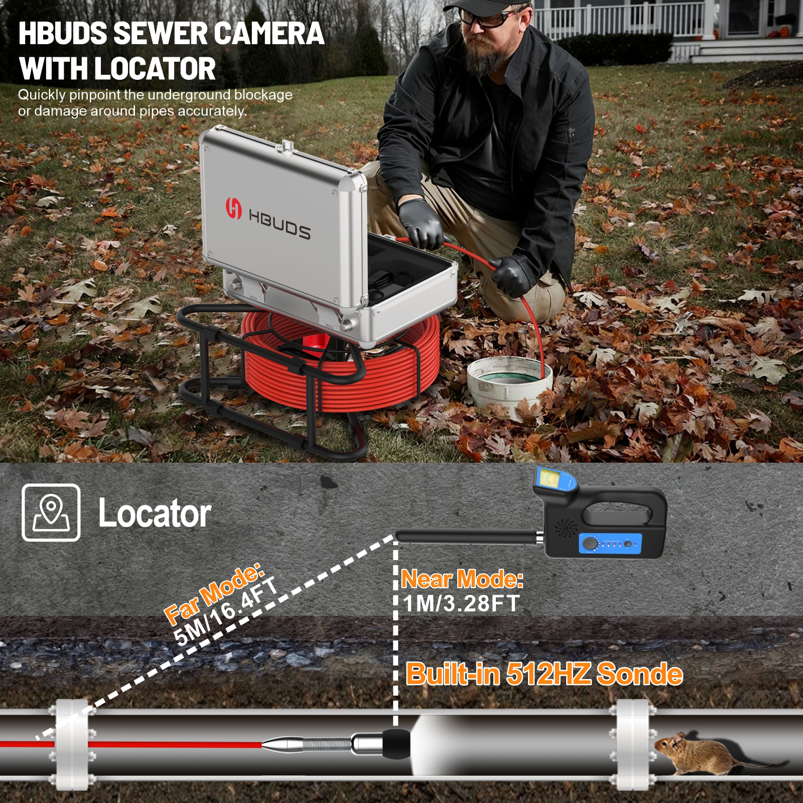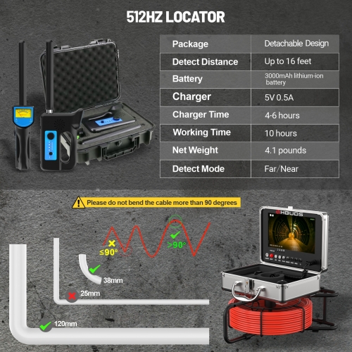 【Sewer Camera with Locator】- The sewer camera has a built-in 512hz sonde transmitter in the probe tip that emits a 512 hertz signal. Using a 512hz signal receiver above ground, you can pinpoint where the camera probe is underground finding the blockage or damage around pipes accurately. The rechargeable receiver has two detecting modes for accurate locating (Detecting Distance Far Mode:16.4 feet, Near Mode: 3.28 feet).