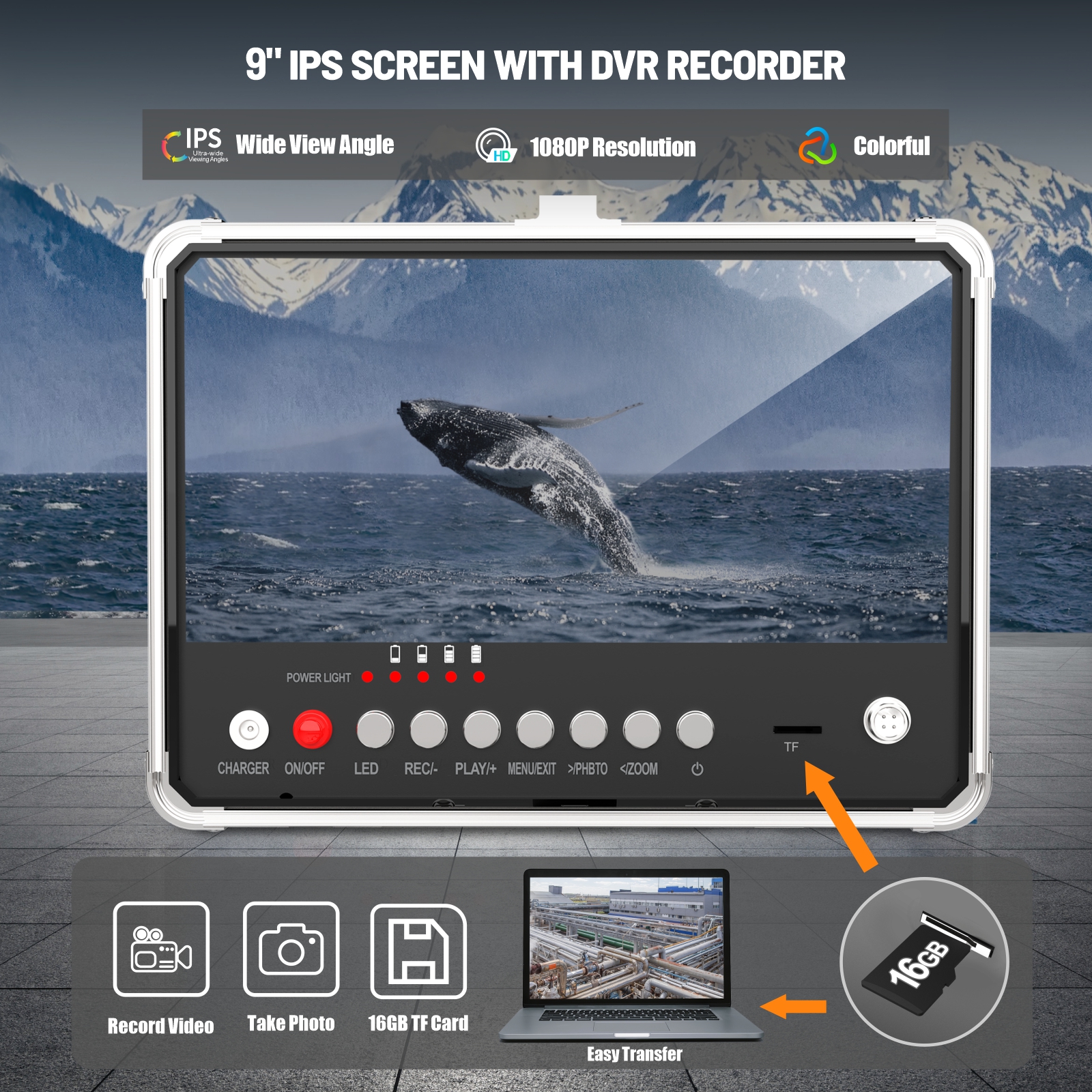 【9 inch IPS Monitor & 1080P HD Camera】- When it comes to color accuracy, IPS monitors surpass the performance of TN and VA monitors with ease. The expansive viewing angles provided by IPS monitors help to deliver outstanding color when being viewed from different angles. Additionally, with 1080P high resolution camera probe, 12pcs adjustable white LED lights and 5x digital zoom function, you can always capture clearer and more true details even in total darkness, underground or underwater.