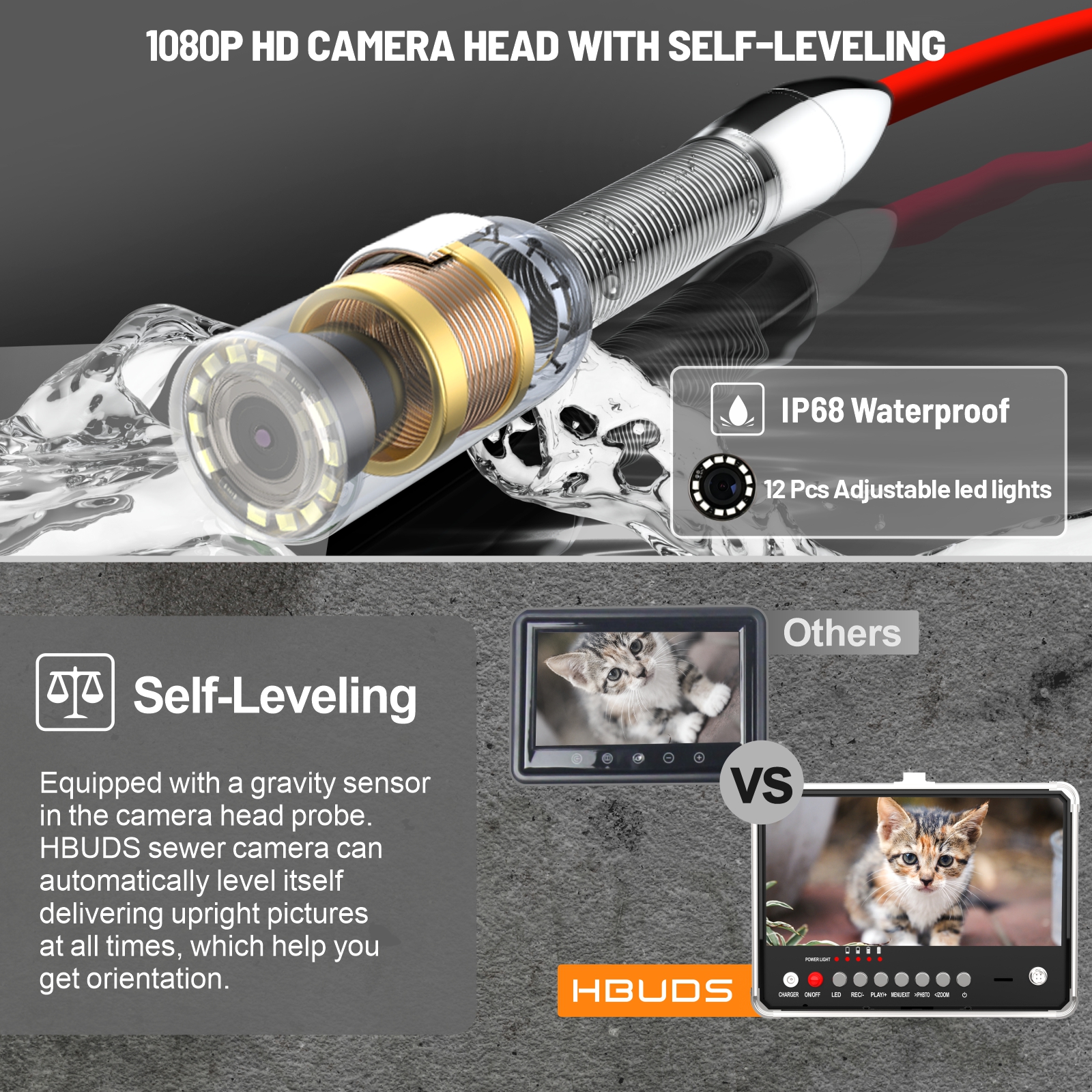 【Self-leveling and IP68 Waterproof Camera】- Equipped with a gravity sensor in the camera head probe. It can automatically level itself, irrespective of the angle at which the device is tilted. The self-leveling pipe cameras delivers upright pictures at all times, which help you get orientation. The IP68 waterproof camera and semi-rigid cable brings you a good operation experience when pushing the camera into the pipelines diameters at 1-8 inches.